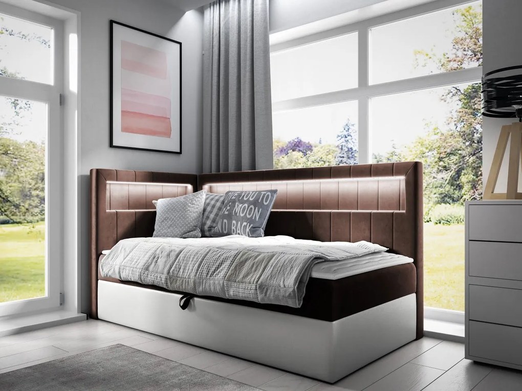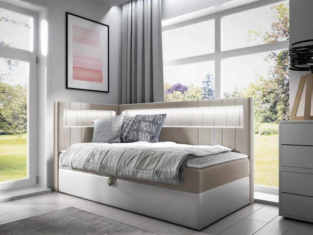 Moderná kontinentálna posteľ pre jednu osobu Junior Ribezo 3 zaisťuje pohodlný odpočinok. Výber niekoľkých šírok umožňuje prispôsobiť si nábytok vášmu pohodliu.Ozdobným prvkom postele je čalúnené čelo a bočnica. Posteľ má aj LED osvetlenie. Okrem pekného vzhľadu plní ešte jednu dôležitú úlohu – chráni steny pred odreninami a nečistotami.Jednolôžková kontinentálna posteľ Ribezo 3 je vybavená aj úložným priestorom. Umožňuje diskrétne uložiť na noc vankúš, prikrývku alebo deku.Dostupné rozmery:80:hĺbka: 212 cm, šírka: 92 cm, výška: 115 cm,plocha na spanie: 80 x 200 cm,rozmery úložného boxu: hĺbka: 197 cm, šírka: 77 cm, výška 25 cm,90:hĺbka: 212 cm, šírka: 102 cm, výška: 115 cm,spacia plocha: 90 x 200 cm,rozmery úložného boxu: hĺbka: 197 cm, šírka: 87 cm, výška 25 cm100:hĺbka: 212 cm, šírka: 112 cm, výška: 115 cm,plocha na spanie: 100 x 200 cm,rozmery úložného boxu: hĺbka: 197 cm, šírka: 97 cm, výška 25 cmPrevedenie:konštrukcia: 16 mm laminovaná doska + 6 cm hrubé drevo,operadlo: 16 mm hrubá doska + T25 vysokoelastická pena,má úložný priestor - zdvíhanie vďaka pružinám, vďaka čomu je obsluha veľmi jednoduchá a ľahká,hlavný matrac: bonellové pružiny + T25 vysokoelastická pena,stupeň tvrdosti hlavného matraca (stredná vrstva lôžka): T3 - stredne tvrdý,v hornej časti - horný matrac (Mandula topper):stredne tvrdý,hrúbka cca 2,5 cm,prešívaný poťah,topper vyrobený z najkvalitnejších hypoalergénnych materiálov:antibakteriálna a protiplesňová polyesterová tkanina 200 g.,20 mm PU pena: vyznačuje sa vysokým stupňom hustoty, primeranou tvrdosťou a elasticitou, nízkou náchylnosťou na deformáciu, vysokým komfortom používania,netkaná textília s vysokou vzdušnosťou 100 g vyrobená z polyesterového vlákna,fleece 35 g z kvalitnej netkanej textílie,polyesterové mikrovlákno 82 g: priedušné, vysoká absorpcia vlhkosti, antialergické, bariéra proti prachu a roztočom,topper má 4 odolné upevňovacie gumy, ktoré zabraňujú pohybu matraca,lem: olemovaný páskou po obvode,obojstranné - obe strany sú využiteľný priestor,matrac sa odporúča otočiť každé 2-3 mesiace,prateľný na 30˚Cplastové nohy,posteľ nie je voľne stojaca,osvetlenie čela v cene postelevýber strany postele určuje, z ktorej strany sa otvára úložný priestorZáruka: 24 mesiacov