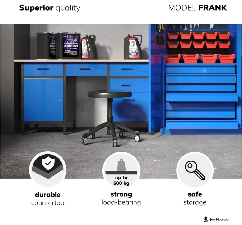 Dielenský stôl FRANK so zásuvkami: antracitovo modrý Ak vám chýba vhodné pracovné miesto v garáži či dielni, a už máte dosť neustáleho strácania náradia – máme pre vás riešenie. Tento problém vyrieši dielenský stôl FRANK s priestrannými zásuvkami, odolnými policami a širokou pracovnou plochou. Pracovný stôl je nevyhnutným vybavením každej dielne, ale aj základom pohodlnej a bezpečnej práce v pneuservisoch, remeselníckych dielňach, či pre domácich majstrov pracujúcich v súkromí vlastnej garáže, preto sa oplatí staviť na praktický, ergonomický a odolný model. Pracovný stôl FRANK – recept na garážový neporiadok Dielenský nábytok značky JAN NOWAK je navrhnutý tak, aby vám uľahčil a spríjemnil vašu prácu. Tento model dielenského stola má až šesť priestranných zásuviek odolných voči zaťaženiu. Môžete do nich schovať náradie, rôzne diely a mnoho ďalších potrebných vecí. Za dvierkami uzamykateľnými kľúčom sú police. Môžete v nich bez obáv odložiť aj cenné vybavenie, či dokumenty. Pracovná doska stola FRANK má rozmery 60 × 170 cm. Vďaka tomu môžete pracovať pohodlne a bezpečne. Vykonávanie rôznych koníčkov sa stane veľmi príjemné! Je odolný voči poškodeniu, takže na ňom môžete smelo pracovať aj s mechanickým náradím či ostrými nástrojmi. Konštrukciu sme vyrobili z ocele, aby sme vytvorili čo najodolnejší dielenský stôl, a to aj v náročných podmienkach (vlhkosť, mráz). Navyše je povrch natretý práškovou farbou, čo vytvára dodatočnú ochrannú vrstvu nábytku. 6 zásuviek a skrinka – všetko nevyhnutné náradie vždy poruke Úložný priestor je silnou stránkou pracovného stola FRANK. 6 zásuviek vám umožní mať všetko potrebné náradie vždy pri sebe, no zároveň uľahčí udržiavanie poriadku. Praktický dielenský stôl FRANK má aj skrinku uzamykateľnú kľúčom s policami. Mimoriadne užitočné riešenie, ktoré sa skvelo hodí do dielne, v ktorej pracuje množstvo technikov, ale aj do garáže, pretože umožňuje ľahko obmedziť prístup detí k nebezpečnému náradiu. Nastaviteľné nožičky – dielenský stôl FRANK zostáva vo vodorovnej polohe za každých podmienok Presnosť je mimoriadne dôležitá, či už ide o skomplikované opravné práce, či konštruovanie vysnívaného kŕmidla pre vtáky, preto aj to najmenšie zakolísanie pracovnej dosky môže negatívne ovplyvniť vykonávanú úlohu. Aby ste takým situáciám zabránili, praktický dielenský stôl FRANK spočíva na nastaviteľných nožičkách, vďaka ktorým bleskovo vyrovnávajú prípadné nerovnosti. Nastaviteľné nožičky umožňujú prispôsobiť výšku a stabilitu voči podkladu, aj vtedy, keď podlaha nie je úplne rovná. Funkcionalita ruka v ruke s estetikou V prípade garážového nábytku má funkčnosť vždy prednosť pred estetikou. Avšak to neznamená, že pracovný stôl nemôže vyzerať atraktívne. Preto si môžete vybrať farbu stola podľa vlastných predstáv z dostupných variantov: červený, modrý, čierny. Táto voľba vám umožní zladiť pracovný stôl FRANK s iným dielenským nábytkom značky JAN NOWAK, napríklad so skrinkami na náradie. Dielenský stôl FRANK – technické údaje: Hmotnosť: 85.4 kg Farba:antracitovo-modrá Výška: 85 cm Šírka: 170 cm Hĺbka: 60 cm Maximálna nosnosť do 570 kg Prípustné zaťaženie zásuvka 45 kg, polica 50 kg Stolová doska: vyrobená z odolnej laminovanej dřevotřískovej dosky s hrúbkou 30 mm Závit nastaviteľných nožičiek: 9 mm