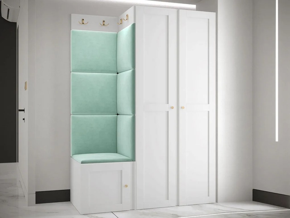 Elegantná predsieňová zostava Terospito XXIII so šatníkovou skriňou je priestranným a funkčným riešením na uloženie oblečenia a obuvi. Súčasťou tohto modelu sú aj vešiaky a skrinka na topánky. Jeho výnimočne dekoratívna časť je vyrobená z čalúnených panelov, ktoré majú tiež vlastnosti pohlcujúce zvuk a ochranné vlastnosti. Nábytok umožňuje pohodlné uloženie rôznych druhov oblečenia a obuvi.Šatníková skriňa je vyrobená z kvalitných materiálov, čo zaručuje odolnosť a elegantný vzhľad. Toto riešenie umožňuje organizovať priestor a umožňuje štýlové usporiadanie miestnosti. Bude tiež kľúčovým prvkom sály, ktorý nás a našich hostí privíta krásnou vizuálnou vrstvou.Rozmery:Skrinka 1D na topánky:šírka: 42 cm, výška: 42 cm, hĺbka: 46 cm,Vešiak na šaty 42: x2šírka: 42 cm, výška: 16 cm, hĺbka: 4,6 cm,Šatníková skriňa 2D:šírka: 74 cm, výška: 186 cm, hĺbka: 46 cm,Čalúnený panel Pag 42x42: x7šírka: 42 cm, výška: 42 cm, hĺbka: 4 cmPrevedenie nábytku:Predná strana: 16 mm hrubá MDF doska + 16 mm hrubá drevotrieska,Korpus: drevotrieska s hrúbkou 16 mm,hrany zakončené 0,5 mm PVC dyhou,zlaté kovové rukoväte,plastové nohy vo farbe korpusu,obyčajné pánty,vešiaky obsahujú 8 dvojháčikovPrevedenie čalúneného panelu:materiál: podložkou panelu je doska s hrúbkou 8 mm + 3 cm hrubá pena T18 + látka,tvar: štvorcový,3D efekt,chráni steny pred poškodením,zvukotesný,spôsob montáže: lepidlom, suchým zipsom alebo montážnou penou (v cene nie je zahrnuté toto príslušenstvo, zákazník si ho kupuje sám),aplikácia: vnútri,panely ideálne na dokončenie stenyZáruka: 24 mesiacov