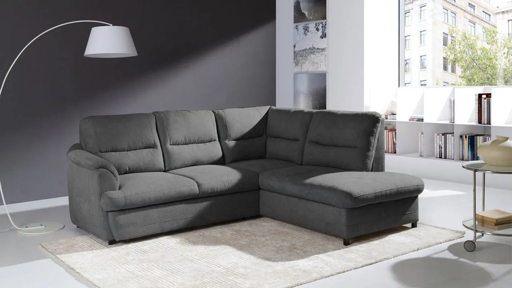 Rozkladacia rohová čalúnená sedacia súprava s úložným priestorom do tvaru L AVESTA pravá sivá