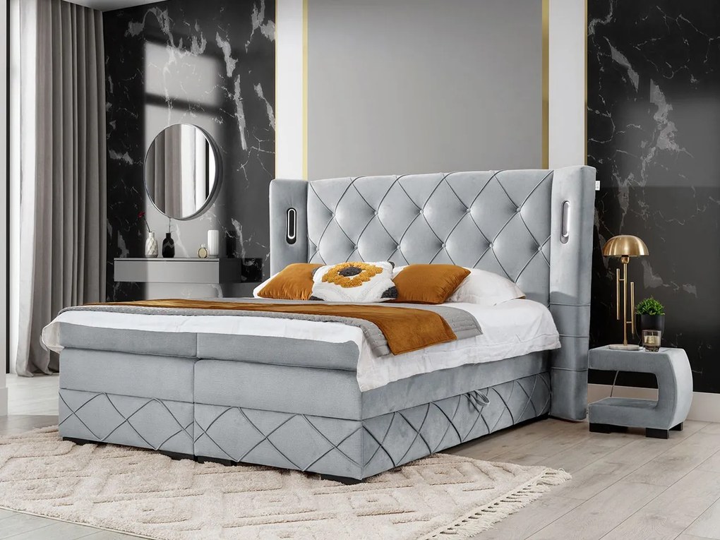 Kontinentálna posteľ Banjul Lux vám spríjemní spánok a každá chvíľa strávená v nej bude plná luxusu a pohodlia. Tento vysoko funkčný model bol navrhnutý s ohľadom na vaše potreby. Je vybavená dvoma kontajnermi na lôžkoviny umiestnenými na oboch stranách, vďaka čomu je ukladanie a prístup k lôžkovinám mimoriadne pohodlný.Prezentovaný variant má dva matrace: hlavný a vrchný. Vrchný matrac je vyrobený z hypoalergénnych materiálov. Antibakteriálna a protiplesňová polyesterová pletenina zaručuje sviežosť a hygienu na dlhú dobu. Má tiež štyri robustné upevňovacie gumy, ktoré zabraňujú pohybu matraca, čím zabezpečujú pokojný spánok bez nepríjemných posunov.Kontinentálna posteľ nie je len o pohodlí, ale aj o kráse. Mimoriadne zdobené čelo z nej robí ozdobu vašej spálne a osvetlenie podčiarkne úžasný charakter každého interiéru.Dostupné rozmery:120:hĺbka: 212 cm, šírka: 168 cm, výška: 138 cm,plocha na spanie: 120 x 200 cm,rozmery jedného kontajnerového priestoru (posteľ má dva): hĺbka: 197 cm, šírka: 56 cm, výška: 19 cm,140:hĺbka: 212 cm, šírka: 188 cm, výška: 138 cm,plocha na spanie: 140 x 200 cm,rozmery jedného oddelenia kontajnera (posteľ má dve): hĺbka: 197 cm, šírka: 66 cm, výška: 19 cm,160:hĺbka: 212 cm, šírka: 208 cm, výška: 138 cm,plocha na spanie: 160 x 200 cm,rozmery jedného oddelenia kontajnera (posteľ má dve): hĺbka: 197 cm, šírka: 76 cm, výška: 19 cm,180:hĺbka: 212 cm, šírka: 228 cm, výška: 138 cm,plocha na spanie: 180 x 200 cm,rozmery jedného oddelenia kontajnera (posteľ má dve): hĺbka: 197 cm, šírka: 86 cm, výška: 19 cm,200:hĺbka: 212 cm, šírka: 248 cm, výška: 138 cm,plocha na spanie: 200 x 200 cm,rozmery jedného oddelenia kontajnera (posteľ má dve): hĺbka: 197 cm, šírka: 96 cm, výška: 19 cmPrevedenie:Truhlica: 16 mm hrubá nábytková doska + 6 cm hrubé drevo,operadlo: 16 mm nábytková doska + borovicové drevo + pena T25 + 300 g nadýchaného rúna,má dva kontajnery na lôžkoviny - posteľ štandardne s dvoma kontajnermi na lôžkoviny, na oboch stranách postele, zdvíhanie oboch častí vďaka pružinám, vďaka čomu je obsluha veľmi jednoduchá a ľahká,hlavný matrac: taštičkové pružiny + pena T25,stupeň tvrdosti hlavného matraca (stredná vrstva postele): H3,úplne hore - vrchný matrac (vrchný matrac Mandula):(matrac): stredne tvrdý,hrúbka približne 2,5 cm,prešívaný poťah,topper vyrobený z hypoalergénnych materiálov najvyššej kvality: antibakteriálna a protiplesňová polyesterová pletenina s gramážou 200 g/m2,20 mm PU pena: vyznačuje sa vysokou hustotou, primeranou tvrdosťou a pružnosťou, nízkou náchylnosťou na deformáciu, vysokým komfortom používania,vysoko nadýchané rúno 100 g/m² z polyesterového vlákna,rúno s gramážou 35 g/m² z vysokokvalitnej netkanej textílie,82 g/m² polyesterové mikrovlákno: priedušné, vysoká absorpcia vlhkosti, antialergické, bariéra proti prachu a roztočom,topper má 4 silné upevňovacie gumy, ktoré zabraňujú pohybu matraca,lemovanie: lemované páskou po obvode,obojstranný - obe strany poskytujú použiteľný povrch,odporúča sa matrac obracať každé 2 - 3 mesiace,možno prať na 30˚Cčierne drevené nohy vysoké 4 cm,posteľ nie je voľne stojaca - operadlo je čalúnené vláknitým textilom,osvetlenie v cene postele,nočný stolík zobrazený na obrázku nie je v cene posteleZáruka: 24 mesiacov