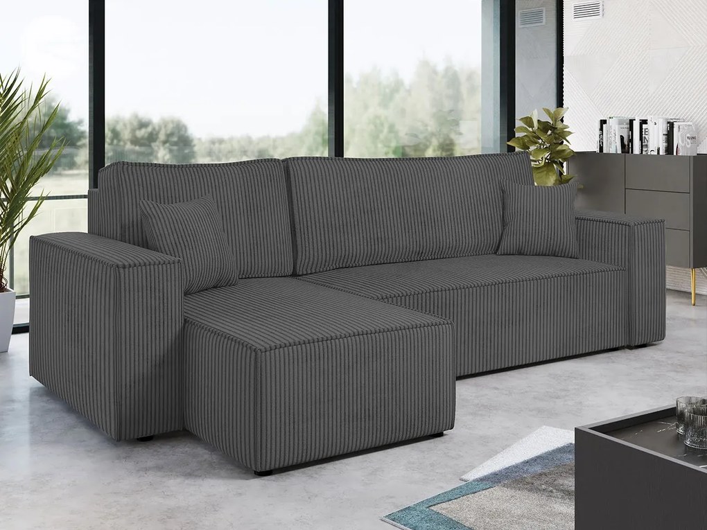 Rozkladacia rohová čalúnená sedacia súprava s úložným priestorom do tvaru L AVESTA pravá sivá