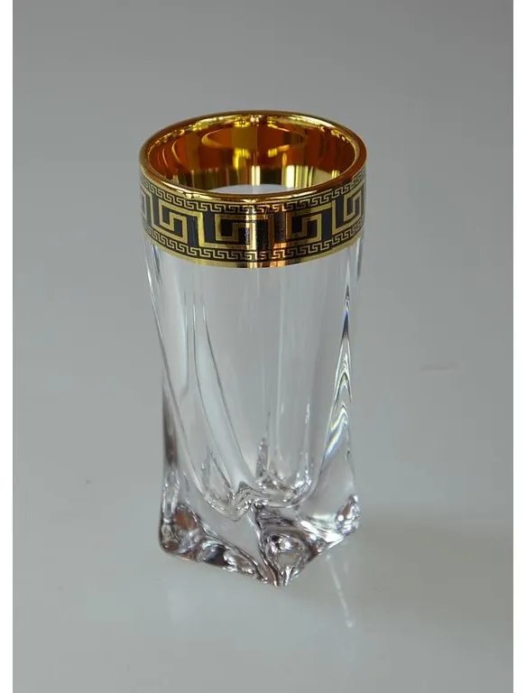 Krištáľová súprava na likér Quadro Verso Gold obsahuje štýlovú karafu s objemom 500 ml a šesť zdobených pohárikov s objemom 50 ml . Celá súprava je vyrobená z krištáľového skla najvyššej kvality a zdobená elegantným čierno-zlatým dekórom , ktorý jej dodáva výnimočný charakter. Svojím precíznym spracovaním a sofistikovaným vzhľadom predstavuje skvelý darček aj vkusný doplnok každého interiéru. Výrobky nie sú vhodné na umývanie v umývačke riadu.