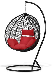 Konštrukcia kresla je vyrobená z oceľových rúrok, ktoré sú ošetrené práškovou farbou Súčasťou balenia je aj pohodlná poduška. Špecifikácia: Farba podušky: červená Farba konštrukcie: čierna Výška konštrukcie: 192 cm Šírka podstavy: 101 cm Kôš/vajíčko: Výška:116 cm Šírka: 107 cm Hĺbka koš: 65 cm Výška sedu: 50 cm Hmotnosť: 30 kg Nosnosť. 120 kg Materiál konštrukcie: kov Materiál podušiek: polyester