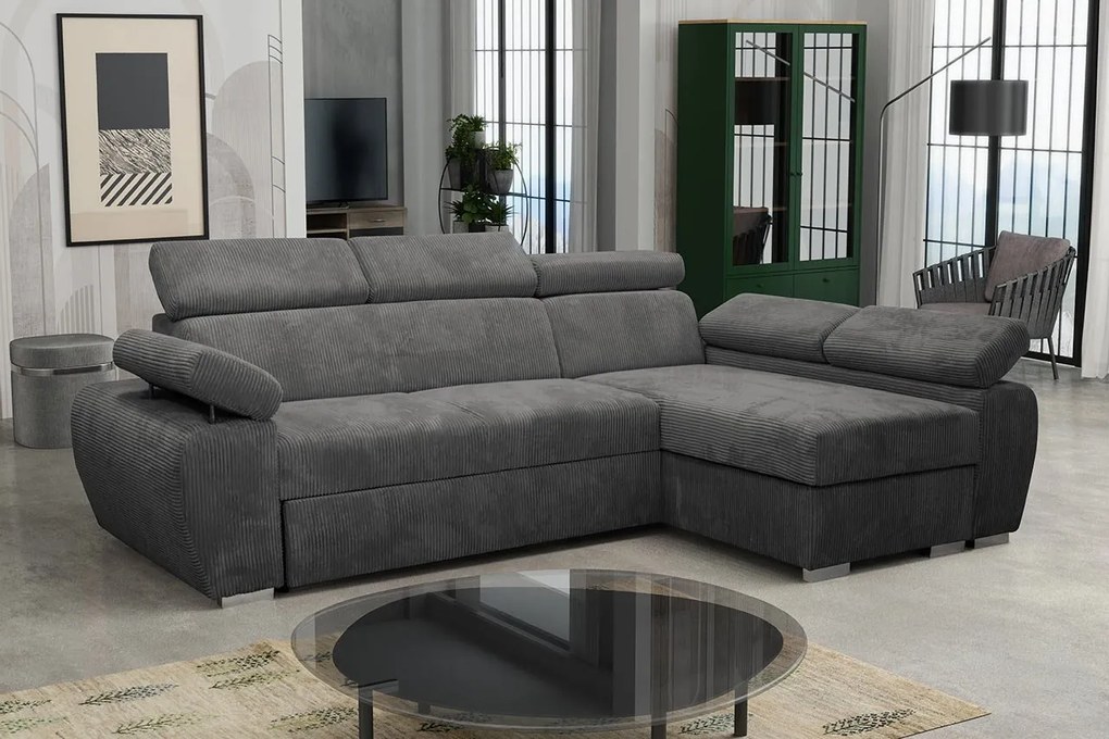 Rozkladacia rohová čalúnená sedacia súprava s úložným priestorom do tvaru L AVESTA pravá sivá