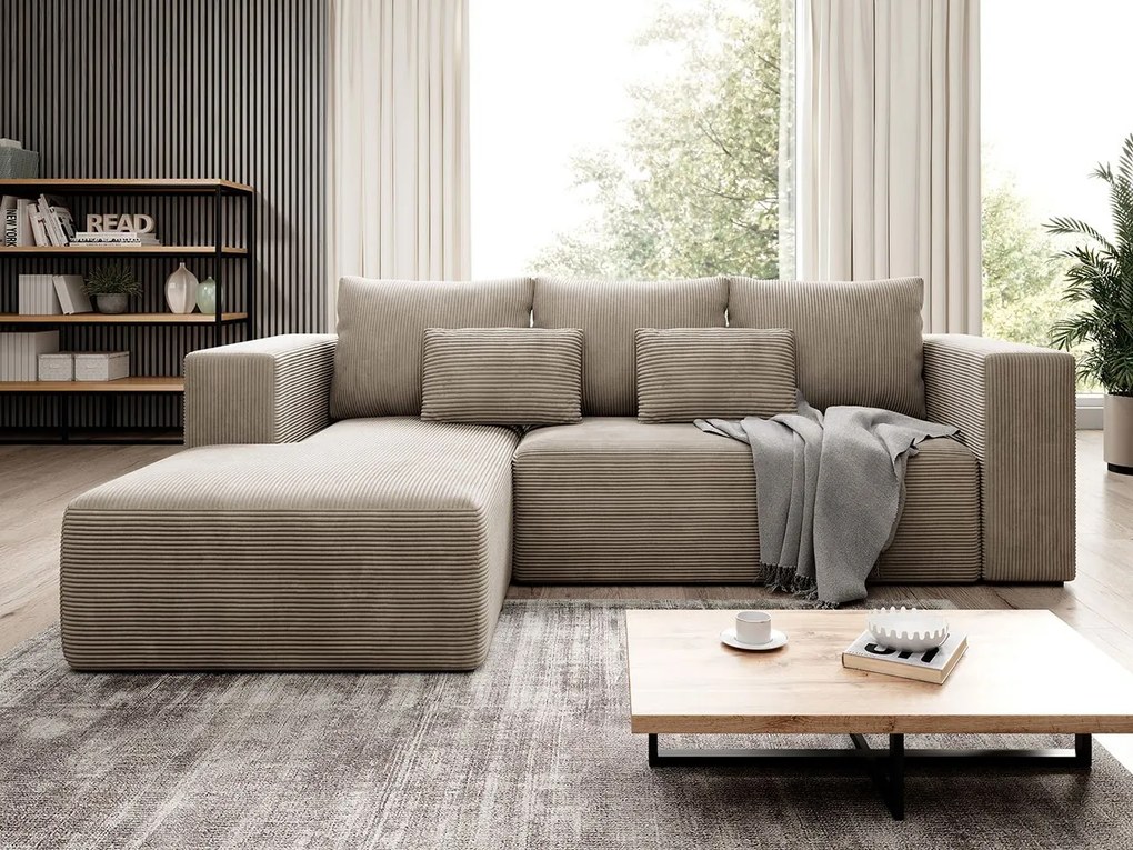Moderná rohová sedačka Zozolia vnesie útulnosť do každej miestnosti. Ako centrálna súčasť dekoru zdobí priestor, dodáva mu moderný charakter a zvyšuje funkčnosť obývačky. Rebrované čalúnenie sa perfektne hodí ku každému dekoru. Zvlášť vyzdvihuje čaro škandinávskych, moderných a rustikálnych interiérov.Ďalšou praktickou výhodou nábytku je možnosť rozloženia. Jednoduchosť prípravy miesta na spanie podporuje špeciálny stroj. S jeho pomocou pohovku rýchlo rozložíte a zložíte.Rohová sedačka v tvare L má aj úložný priestor. Vankúše a v ňom umiestnené periny sú skvelou zásobou, ak potrebujete ubytovať hostí cez noc.Rozmery:šírka: 255 cm,hĺbka: 161 cm,výška: 91 cm,plocha na spanie: 205 x 121 cm,rozmery úložného priestoru:dĺžka: 132 cm,šírka: 61 cm,výška: 23 cmRohová strana: ľavá alebo praváPrevedenie:rám vyrobený z dreva a drevotriesky,sedadlo: pena T30 + vlnitá pružina typu A,operadlo: T30 pena,roh je rozvinutý,automatický rozkladací stroj typu DL,s funkciou spánku,má nádobu na podstielku,čierne plastové nohy,roh typu L,chrbtová opierka vo forme pohyblivých vankúšov na zips,vankúše plnené penovými granulami,voľne stojaci roh (chrbát čalúnený látkou)Záruka: 24 mesiacov