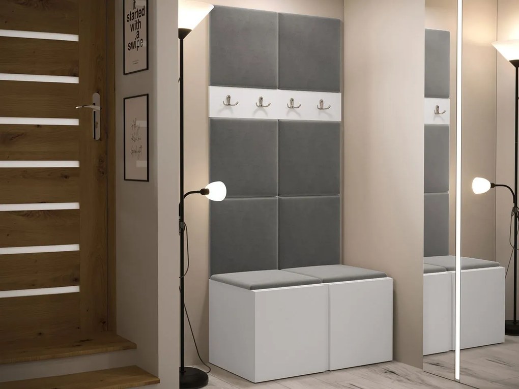 Predsieň Tavasz je kombináciou dekoratívnych prvkov a funkčnosti. Nábytok pozostáva z troch odlišných prvkov. Prvou je botník s niekoľkými policami a pohodlným sedadlom z čalúnených panelov. Čalúnené panely sú prvkom, ktorý skriňu Tavasz odlišuje, sú nielen pohodlnou oporou pri obúvaní, ale aj zaujímavým dekoratívnym prvkom nábytku. Panely sú dostupné v módnych farebných variantoch, ktoré zdôraznia charakter interiéru. Posledným prvkom zostavy je skriňa so štyrmi dvojitými vešiakmi.Skrinky sú univerzálne, takže je možné ich namontovať podľa želania - vpravo alebo vľavo.Lepidlo na panely nie je dodávané s panelmi.Rozmery:Skrinka na topánky:šírka: 84 cm, výška: 42 cm, hĺbka: 46 cm,Vešiak na šaty 84:šírka: 84 cm, výška: 16 cm, hĺbka: 4,6 cm,Čalúnený panel Pag 42x42: x8šírka: 42 cm, výška: 42 cm, hĺbka: 4 cmPrevedenie:16 mm hrubá laminovaná doska,okraje sú zakončené odolnou 0,5 mm PVC dyhou, ktorá je odolná voči každodennému používaniu,žiadne rukoväte,plastové nohy,obyčajné pánty,vešiaky obsahujú 4 dvojité háčikyPrevedenie čalúneného panelu:materiál: základom panelu je doska s hrúbkou 8 mm +3 cm hrubá pena T18 + látka,tvar: štvorcový,3D efekt,chráni steny pred poškodením,zvukotesný,aplikácia: interiér,Záruka: 24 mesiacov