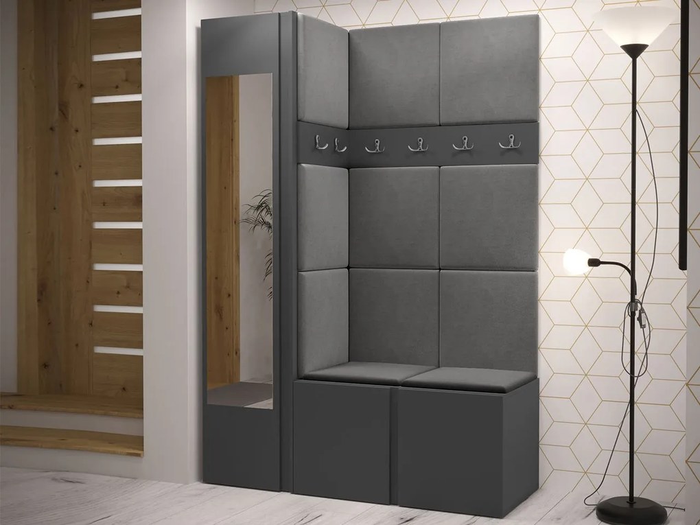 Predsieňová zostava Tavasz X skvele doplní priestor v každom byte. Jeho nepochybnou výhodou je zrkadlo. Toto riešenie ho robí ešte praktickejším, pretože okrem úložného priestoru máme možnosť sa pred odchodom z domu aj rozhliadnuť.Môžete si do nej schovať topánky a ich obúvanie bude mimoriadne jednoduché vďaka tomu, že ide o kus nábytku do predsiene so sedačkou. Farby čiel a čalúnených panelov sú široké a prispôsobené väčšine projektov. Absencia úchytiek dodáva moderný charakter.Je to kus nábytku, ktorý nás víta hneď po vstupe do domu. Stojí za to zabezpečiť, aby šatník bol výkladnou skriňou haly.Rozmery:šatníková skriňa so zrkadlom 40:šírka: 40 cm, výška: 186 cm, hĺbka: 46 cm,skriňa na topánky:šírka: 84 cm, výška: 42 cm, hĺbka: 46 cm,vešiak na šaty 84:šírka: 84 cm, výška: 16 cm, hĺbka: 4,6 cm,vešiak na oblečenie 42:šírka: 42 cm, výška: 16 cm, hĺbka: 4,6 cm,čalúnený panel Pag 42x42 x11:šírka: 42 cm, výška: 42 cm, hĺbka: 4 cmDizajn nábytku z tvrdého dreva:16 mm hrubá laminovaná doska,hrany sú upravené odolnou a každodennému používaniu odolnou 0,5 mm PVC dyhou,žiadne rukoväte,plastové nožičky,bežné závesy,zrkadlo na prednej strane,vešiaky obsahujú 6 dvojitých háčikovČalúnený panel:materiál prevedenia: podklad panelu je 8 mm hrubá doska +3 cm hrubá pena T18 + látka,tvar: štvorcový,3D efekt,chráni steny pred poškodením,pohlcovanie zvuku,použitie: pre interiér,panely ideálne na povrchovú úpravu stienSkrinky sú univerzálne, takže je možné ich namontovať podľa želania - vpravo alebo vľavo.Lepidlo na panely nie je dodávané s panelmi.Záruka: 24 mesiacov