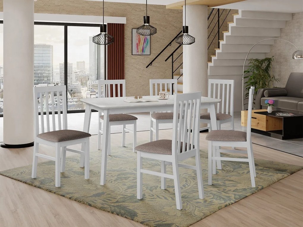 Rozkladací stôl so 6 stoličkami AL16, Morenie: biela, Poťahové látky: Hygge D20, Farby nožičiek: biela