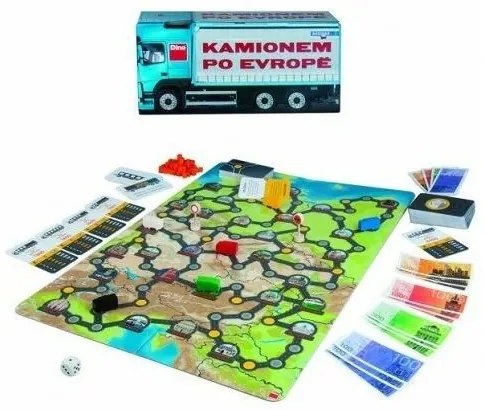 Legendárne kamióny už čakajú, až zavelíte na odchod. Nemusíte ani nikam cestovať, Kamiónom po Európe sa prejdete v pohodlí svojej obývačky. Obľúbená dosková hra s dlhoročnou tradíciou sa teraz vracia v novej grafickej úprave a absolútne štýlovom obale. Vydajte sa s nákladom do európskych miest, buďte pri jeho doprave najrýchlejší a odtrhnite čo najviac peňazí. Potom na vás čaká opojné víťazstvo. Kamioňáckym pretekom sa môžu oddávať už 2 hráči, celkom vás ale môže byť až 6.Hra obsahuje: 1 herný plán, 6 drevených kamiónov v 6 farbách, 1 hraciu kocku, 124 ks bankoviek (31 ks od hodnoty 100, 500, 1 000 a 5 000), 91 kariet (52 ks zákaziek, 31 ks náhody, 2 x 4 ks prívesov), 70 ks nákladov, 2 značky so samolepkami.