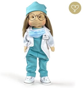 Zmeria teplotu, dá medvedíkovi injekciu a pomôže mu vypiť zlý sirup. Bude vás sprevádzať v každej hre na nemocnicu/doktorku, pretože žiadna choroba pre ňu nie je desivá! Bábika je vysoká cca 40 cm, je vyplnená certifikovanou polyesterovou vlnou. Materiál, z ktorého je vyrobený, vyrába švajčiarska spoločnosť so 120-ročnými skúsenosťami na textilnom trhu. Látka je špeciálne tkaná na šitie bábik. Bábika je určená pre deti od 3 rokov. Starostlivosť o bábiku: -som ručne šitá, preto nikdy nebudem ako iná bábika (aj keď budem mať rovnaké meno) -staraj sa o mňa s láskou -ak ma chceš umyť, urob to ručne, s použitím jemných prostriedkov na pranie, pri teplote okolo 30 stupňov -moje vlasy môžeš česať koľko chceš, nemôžeš ich sušiť, lakovať, kulmovať, nahrievať ani farbiť -bábika má certifikát CE, bola preskúmaná v laboratóriu a získala bezpečnostný certifikát. Meno bábiky je ľubovoľné a poskytnuté iba na účely publikácie. Nie je ani na bábike, ani na škatuli. Čo je to „pohyblivá kostra“: Ide o špeciálnu štruktúru vyrobenú zo vzájomne prepojených plastových prvkov a zabudovanú do tela bábiky, ktorá pripomína ľudskú kostru. Takáto kostra je v prípade ručne vyrábaných látkových bábik absolútne unikátny pojem. Bábika vďaka nemu získava úplne nové schopnosti pózovania, vďaka čomu je hra s ňou oveľa atraktívnejšia. Čo umožní pohyblivá kostra: -Bábiku možno nastaviť do oveľa výraznejšej pózy ako doteraz. -Možnosťou posunutia ťažiska môže bábika stáť na jednej nohe a robiť si napríklad tzv. "lastovičku" -Ohnuté kolená umožňujú položiť bábiku na predmety (napr. na poličku) oveľa atraktívnejšie a vierohodnejšie, a tým pútavejšie. -Nohy bábiky sú ohnuté v mnohých uhloch a na mnohých miestach (nielen kolená, ale aj panva a členky) umožňujú zapletať veci, na ktorých bábika sedí (napríklad hojdací koník, okraj postele) -Bábika vie otáčať hlavičkou nielen zo strany na stranu, ale aj hore a dole. Pozor: Kostra nie je implementovaná v ruke bábiky. Ruky zostávajú bezvládne a voľne visia pozdĺž tela bábiky.