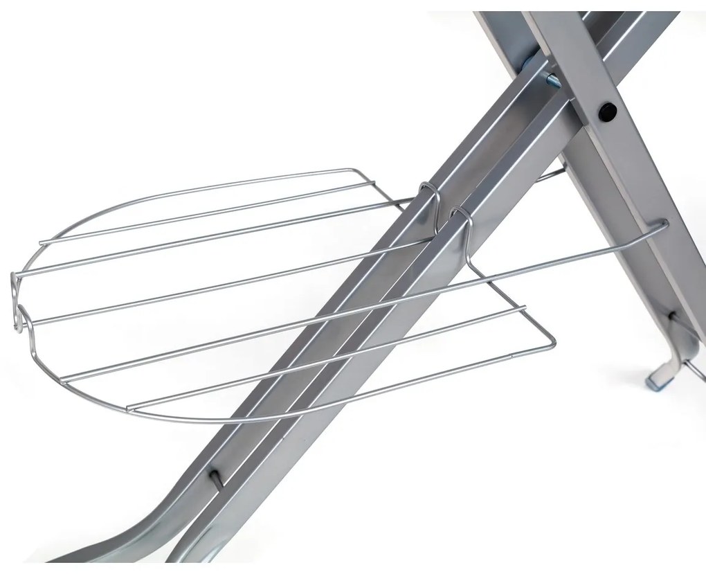Žehliaca doska Professional s rozmermi 130 x 48 cm je vybavená kovovou doskou Mash, ktorá dobre prepúšťa paru a zaisťuje, že bielizeň zostane suchá. Stabilná konštrukcia žehliacej dosky zaisťuje bezpečné žehlenie. Pevná žehliaca doska umožní ľahké žehlenie aj veľkých kusov bielizne.Žehliaca doska je vybavená integrovanou elektrickou zásuvkou, odkladacím priestorom pre parnú žehličku a plochou pre vyžehlenú bielizeň. Súčasťou žehliacej dosky je tiež rukávnik - mini žehliaca doska, ktoré vám uľahčia žehlenie úzkych rukávov.Galvanizovaná konštrukcia zaisťuje dlhú životnosť žehliacej dosky. Nastaviteľná výška dosky je 73 až 99 cm. Priemer nôh 35 x 20 mm, hrúbka materiálu 0,8 mm.