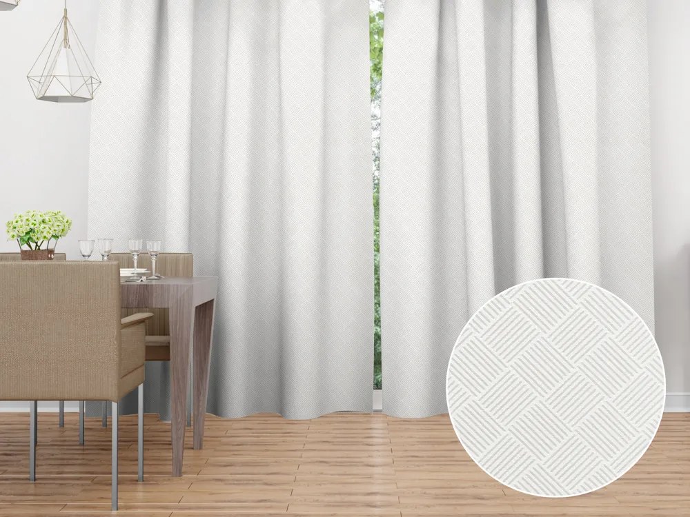 Dekoračný záves s lesklým designovým vzorom prepletaných štvorčekov v smotanovej farbe, ušitý zo 100% polyesterovej látky s vodoodpudivou a nešpinovou teflónovou úpravou, s gramážou 210 g/m2. Z druhej strany je vzor matný bez lesku. Luxusný vzhľad. Záves je určený predovšetkým na dekoračné účely a pre zatienenie miestnosti, nie však pre jej úplné zatemnenie. Záves dodávame kompletne obšitý, s našitou univerzálnou riasiacou stuhou RS-005 (š. 5 cm), ktorá je vhodná pre uchytenie na klasické žabky alebo závesné háčiky. Až doma sa tak môžete rozhodnúť, či si záves nariasíte – viď. detailná fotografia, alebo riasenie nevyužijete a necháte si záves rovný v plnej šírke (dľžke). Nariasenie je veľmi jednoduché – stačí zatiahnúť za sťahovacie šnúrky na konci závesu. Nariasením dôjde ku skráteniu šírky závesu zhruba na polovicu, v závislosti na zvolenej hustote riasenia, výška závesu zostáva rovnaká. Cena je za 1 kus závesu. Ak potrebujete záves na obidve strany okna, objednajte 2 kusy. Uvedené rozmery variantov sú rozmery v roztiahnutom (nenariasenom) stave. Háčiky a žabky na zavesenie nie sú súčasťou závesu. Nevyhovuje Vám ani jeden z nami ponúkaných rozmerov alebo spôsobov uchytenia závesu? Radi Vám ušijeme záves podľa Vašich predstáv a presne na mieru Vášho okna. Šijeme v našich krajčírskych dielňach v ČR.