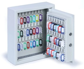 · oceľový trezor na kľúče s elektronickým zámkom s možnosťou nastavenia master kódu · výškovo nastaviteľné lišty s hákmi na kľúče · farebné menovky s krúžkami na kľúče · rozmer š x v x h: 300 x 360 x 100 mm · hmotnosť: 8 kg · hrúbka materiálu: dvere 4 mm, plášť 1,5 mm · balenie vr. batérií, mont. materiálu a 2 ks núdzových kľúčov · farba: sivá (RAL 7035)