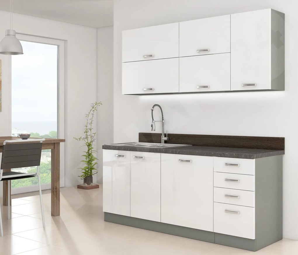 Vybraná varianta:Kuchyňa Multiline III, Farby: šedý / biely lesk, Osvetlenie: bez osvetlenia, Drez: áno, Príborník: áno, Pracovná doska:: áno