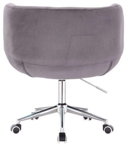 Kreslo MONTANA VELUR na striebornej podstave s kolieskami Moderné a pohodlné kreslo s jednoduchým, ale originálnym tvarom vyrobené z moderného jemného velúru. Kreslo je určené pre salóny krásy, kaderníctvo, moderné kuchyne, reštaurácie, bary, elegantné kancelárie, exkluzívne obchody, stánkyna veľtrhoch, informačné miesta, ale aj domácnosti. Oceľová konštrukcia je výškovo staviteľná, vďaka kolieskam sa s ním ľahko manipuluje. Pre velúr alebo semiš je typický jeho zamatovo hebký a mäkký povrch, materiál je silnejší, odolnejší a jednoduchší na údržbu ako bežné tkaniny. Prešívané operadlo je zdobené potiahnutými gombíkmi. - Pneumatické nastavenie výšky - Otočné sedadlo (360 stupňov) - Kovová základňa s kolieskami - Rozmery na obrázku - výška sedadla od zeme min.- 42 cm - výška sedadla od zeme max - 55 cm - Nosnosť 120 kg