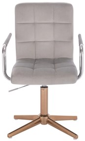 Stolička VERONA VELUR na zlatom kríži Stolička je vhodná pre moderné kuchyne, reštaurácie, bary, exkluzívne obchody, salóny krásy, kaderníctvo, elegantné kancelárie, informačné miesta, stánky na veľtrhoch. Sedák aj opierka chrbta sú polstrované a potiahnuté jemným prešívaným semišom. Poťah - Velúr (semiš) - zamatovo hebký, mäkký materiál, ktorý je silnejší, odolnejší a jednoduchší na údržbu ako bežné tkaniny. Kovová konštrukcia je výškovo staviteľná, pevná, zaručuje stabilitu stoličky. - Pneumatické nastavenie výšky - Otočné sedadlo (360 stupňov) - Stabilná kovová základňa Rozmery na obrázku - Výška sedadla od zeme min. - 38 cm - Výška sedadla od zeme max.- 56 cm Nosnosť 120 kg