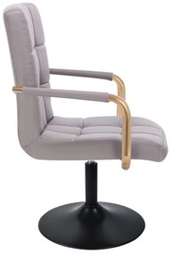 Stolička VERONA GOLD na čiernom tanieri Stolička je vhodná pre moderné kuchyne, reštaurácie, bary, exkluzívne obchody, salóny krásy, kaderníctvo, elegantné kancelárie, stánky na veľtrhoch, informačné miesta. Poťah - prešívaná syntetická koža, ľahko sa udržuje v čistote. Zlaté podrúčky dodávajú stoličke elegantný vzhľad. Pevná kovová základňa zaručuje stabilitu stoličky. - Pneumatické nastavenie výšky - Otočné sedadlo (360 stupňov) - Kovová stabilná základňa Rozmery sedadla na obrázku - výška sedadla od zeme min. - 38 cm - Výška sedadla od zeme max. - 56 cm - Nosnosť - 120 kg