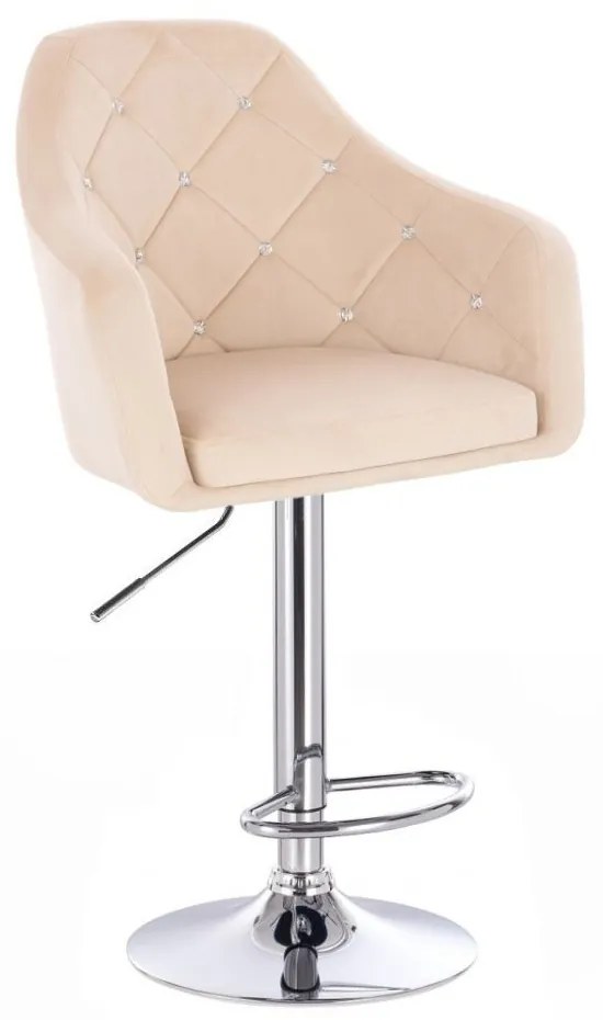 Barová stolička ROMA VELUR na striebornom tanieri Barová stolička zaujme svojim originálnym designom aj náročného užívateľa. Pre svoj elegantný vzhľad je vhodným vybavením nielen moderných kaviarní a barov, ale aj domácností. Sedák aj opierka chrbta sú polstrované a potiahnuté prešitým semišom. Prešívaná opierka je zdobená kryštálmi. Poťah - Velúr (semiš) - zamatovo hebký a mäkký materiál, ktorý je silnejší, odolnejší a jednoduchší na údržbu ako bežné tkaniny. Oceľová konštrukcia je výškovo staviteľná, zaručuje dokonalú stabilitu stoličky. Maximálny komfort pri sedení umožňuje aj opierka nôh. - pneumaticky nastaviteľná výška - otočné sedadlo (360 stupňov) - stabilná kovová základňa Rozmery sedadla na obrázku. Výška sedadla od zeme min. - 60 cm Výška sedadla od zeme max. - 80 cm Maximálna nosnosť : 120 kg