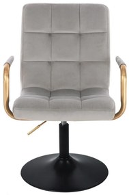 Stolička VERONA GOLD VELUR na čiernom tanieri Stolička je vhodná pre moderné kuchyne, reštaurácie, bary, exkluzívne obchody, salóny krásy, kaderníctvo, elegantné kancelárie, stánky na veľtrhoch, informačné miesta. Moderná a pohodlná stolička s jednoduchým, ale originálnym tvarom potiahnutá moderným a príjemne jemným velúrom (semišom). Ide o materiál, ktorý je silnejší, odolnejší a jednoduchší na údržbu ako bežné tkaniny. Elegantný vzhľad dodávajú stoličke aj zlaté podrúčky. Kovová konštrukcia je výškovo staviteľná, pevná, zaručuje stabilitu stoličky. - Pneumatické nastavenie výšky - Otočné sedadlo (360 stupňov) - Kovová stabilná základňa Rozmery sedadla na obrázku - výška sedadla od zeme min. - 38 cm - Výška sedadla od zeme max. - 56 cm Nosnosť 120 kg