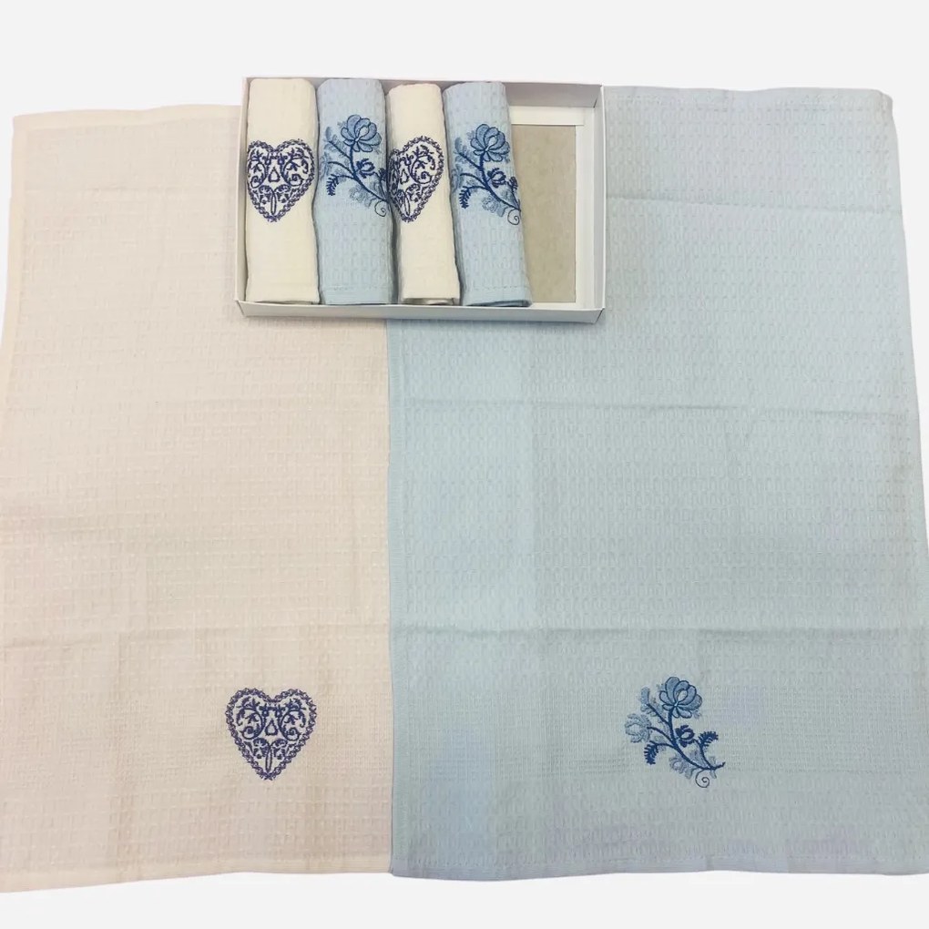 Kvalitné hustotkané bavlnené kuchynské utierky modro-bielych farbách s výšivkou srdiečka. Utierky sú balené v peknej krabičke a preto sú vhodné aj ako darček. Počet ks: 6 Rozmer: 40x60cm Materiál: 100% Bavlna