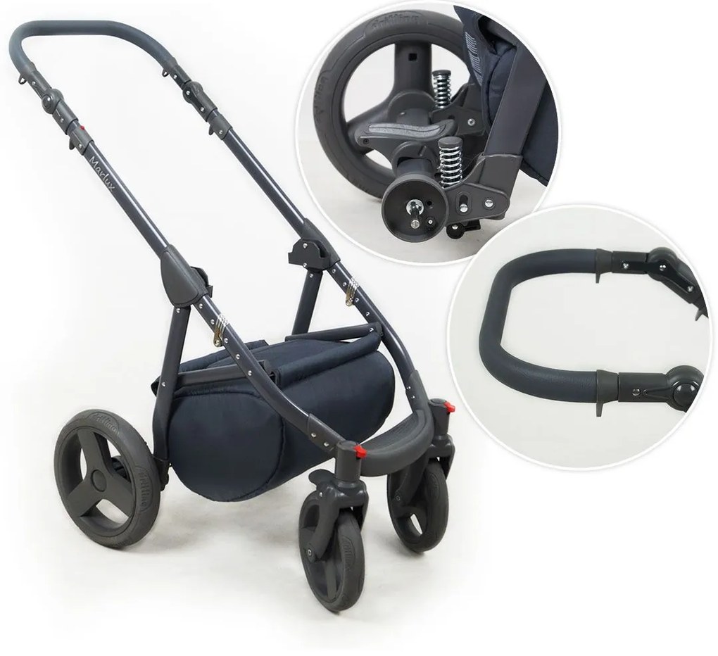 Kočík Raf-pol MARLUX sa vyznačuje veľmi kvalitnou konštrukciou, ktorá je vyrobená z veľmi kvalitnej ľahkej ocele. S kočíkom sa vďaka ľahkej konštrukcií lepšie manipuluje. Poťah kočíka je vyrobený z veľmi odolného, ale zároveň dobre priedušného materiálu, ktorý je aj veľmi dobre umyvateľný. Veľkou prednosťou kočíka MARLUX je veľký nákupný kôš, do ktorého maminka vloží aj väčší nákup a dalšou veľkou prednosťou je veľká hlboká vanička, ktorá sa svojou vnútornou dĺžkou 80 cm, vnútornou šírkou 37 cm a vnútornou výškou 22 cm, radí medzi najväčšie vaničky na trhu. Kočík obsahuje: • Konštrukciu • Hlbokú vaničku • Športovú sedačku • Prenosnú tašku na rukoväť • Moskytiéru a pláštenku, držiak na pitie • Autosedačku • Adaptér na autosedačku • Bezdušové kolesá (kolesá majú rovnaké vlastnosti ako nafukovacie kolesá, pričom sú miesto duše vyplnené špeciálnou penou, ktorá robí koleso neprepíchnuteľným, tým pádom lepším na údržbu) • Rukávníky vo farbe kočíka Technická špecifikacia: • Nastaviteľná rukoväť • Polohovateľná chrbtová časť v športovej časti • Polohovateľný matrac v hlbokej vaničke • Nastaviteľný nánožník pri športovej časti • 5-bodové bezpečnostné pásy • Možnosť nastavenia tuhosti odpruženia ( 2 možnosti tuhosti) • Systém Reverse Seat – možnosť montáže hlbokej vaničky I športovej sedačky v aj proti smeru jazdy • Kočík spĺňa normu EN 1888 • Možnosť aretácie predných kolies • Priemer kolies – predný 22cm, zadný 27 cm Zložená konštrukcia (s kolesami): 85(dĺžka) x 60(šírka) x 40(výška) cm Rozložená konštrukcia (s kolesami): 112(výška) x 59(šírka) x 101(dĺžka) cm Vnútorné rozmery vaničky: 37(šírka) x 80(dĺžka) x 22(výška) cm Rozmery športovej sedačky: 34(šírka) x 48(dĺžka chrbtovej opierky) x 26(dĺžka sedačky) x 23(dĺžka nánožníka) cm Hmotnosť konštrukcie (s kolesami): 9 kg Hmotnosť kočíka so športovou sedačkou: 14 kg Hmotnosť kočíka s hlbokou vaničkou: 14 kg Nastaviteľná výška rukoväti od 77 cm do 121 cm O dostupnosti produktu sa informujte na objednavky69@gmail.com.