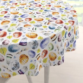 Biante Veľkonočný teflónový okrúhly obrus TF-075 Farebné kraslice a pierka na bielom Ø 140 cm