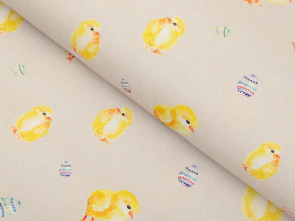 Teflónový obdĺžnikový obrus na jedálenský stôl s veľkonočným vzorom kuriatok a kraslíc na béžovom podklade, vyrobený zo 100% polyesterovej látky s vodoodpudivou a nešpinivou teflónovou úpravou. Je stálofarebný, nezráža sa a veľmi ľahko sa udržuje. Okraje obrusu sú zatavené do tvaru malých oblúčikov - viď. detailné foto, na želanie môžeme obšíť klasickým rovným stehom. Dekoračné obrusy sú praktickým doplnkom interiéru Vášho domu, bytu, chalupy a sú vhodné aj do hotelov a reštaurácií. Ako správne zvoliť rozmer obrusu? Uvedené rozmery sú rozmery obrusu, nie stola. Bežný doporučený presah obrusu je cca 20-30 cm na každú stranu stola, tzn. ak máte stôl s rozmerom napr. 60x100 cm, objednávajte obrus s rozmerom 100x140 cm až 120x160 cm, vždy však s prihliadnutím na vlastné individuálne požiadavky. Šijeme v našich krajčírskych dielňach v ČR, ponúkame aj rozmery na mieru.