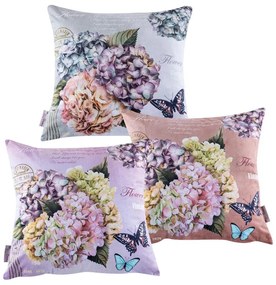 Sada 3 ks obliečok na vankúšiky s krásnym motívom hortenzií vo veľmi obľúbenom vintage štýle. Zamatovohebký materiál, obojstranná potlač, zapínanie na zips. Materiál: 100% polyester Rozmery: 45 x 45 cm Odporúčané pranie: 40 °C