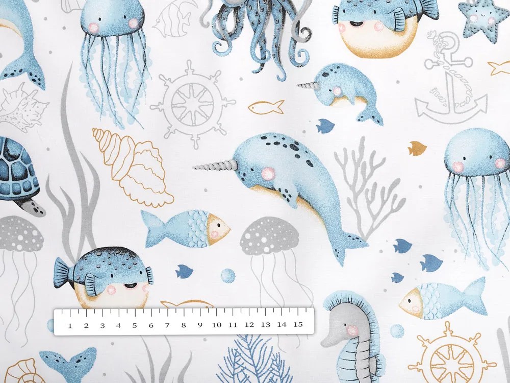 Bavlnená obliečka na vankúš s milým detským motívom modrého morského sveta na bielom podklade. Smer vzoru je otočený vodorovne! Je ušitá z husto tkaného 100% bavlneného plátna s certifikátom zdravotnej nezávadnosti Oeko-Tex 100. Zapínanie na zips je skryté na spodnej strane obliečky a neruší tak jej celkový vzhľad. Bavlnené plátna sú veľmi vzdušné a príjemné na dotyk. K obliečkam na vankúše ponúkame aj výplňové vankúše. Šijeme v našich krajčírskych dielňach v ČR, ponúkame aj rozmery na mieru.