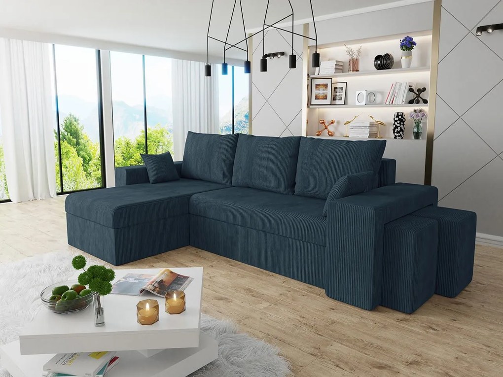 Spoznajte jedinečnú kombináciu, ktorá uprednostňuje relaxáciu u vás doma. Rohová sedacia súprava Tirozi s taburetkou je zaujímavým návrhom do obývacej izby. Pútavé čalúnenie z rebrovanej látky dokonale zapadne do každého štýlu interiéru.Táto súprava obsahuje rozkladaciu rohovú pohovku s funkciou na spanie, doplnenú o dve obliečky. Okrem toho má model aj kontajner na posteľnú bielizeň, ktorý poslúži ako základ na uloženie sezónnych prikrývok, vankúšov alebo prikrývok. Operadlo tohto modelu je vyrobené z pohyblivých vankúšov, zapínaných na zips. Táto možnosť uľahčuje usporiadanie miestnosti. Voľne stojacu rohovú sedačku môžete umiestniť kamkoľvek si vyberiete.Rozmery:Sedačka:Šírka: 256 cm, hĺbka: 139 cm, výška: 80 cmPlocha na spanie: 206 x 130 cmRozmery úložného priestoru: dĺžka: 127 cm, šírka: 55 cm, výška: 19 cmPufy: ( x 2 )Dĺžka: 35 cm, šírka: 35 cm, výška: 42 cmRohová strana: univerzálna (stranu si volí zákazník pri montáži)Prevedenie:Rám: 18 mm drevotrieska + borovicové drevoSedadlo: T30 pena + vlnová pružinaOperadlo: vankúše vyplnené penou (PU)Rohová sedačka je rozkladaciaMá funkciu spánkuÚložný priestorPlastové nohyOperadlo vo forme pohyblivých vankúšovVankúše v cene - zapínané na zipsDve taštičky v ceneVoľne stojaca rohová pohovka (chrbát potiahnutý látkou)Záruka: 24 mesiacovInformácie:Dodávka nezahŕňa zálohu. Vodič doručí vašu objednávku k prvým dverám. Parametre produktu ako rozmery alebo farby sa nemenia. Tovar dostupný len v konfiguráciách uvedených v ponuke.