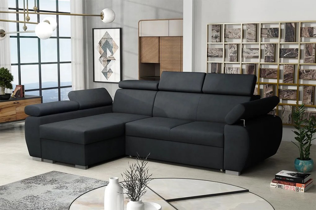 Rozkladacia rohová čalúnená sedacia súprava s úložným priestorom do tvaru L AVESTA pravá sivá