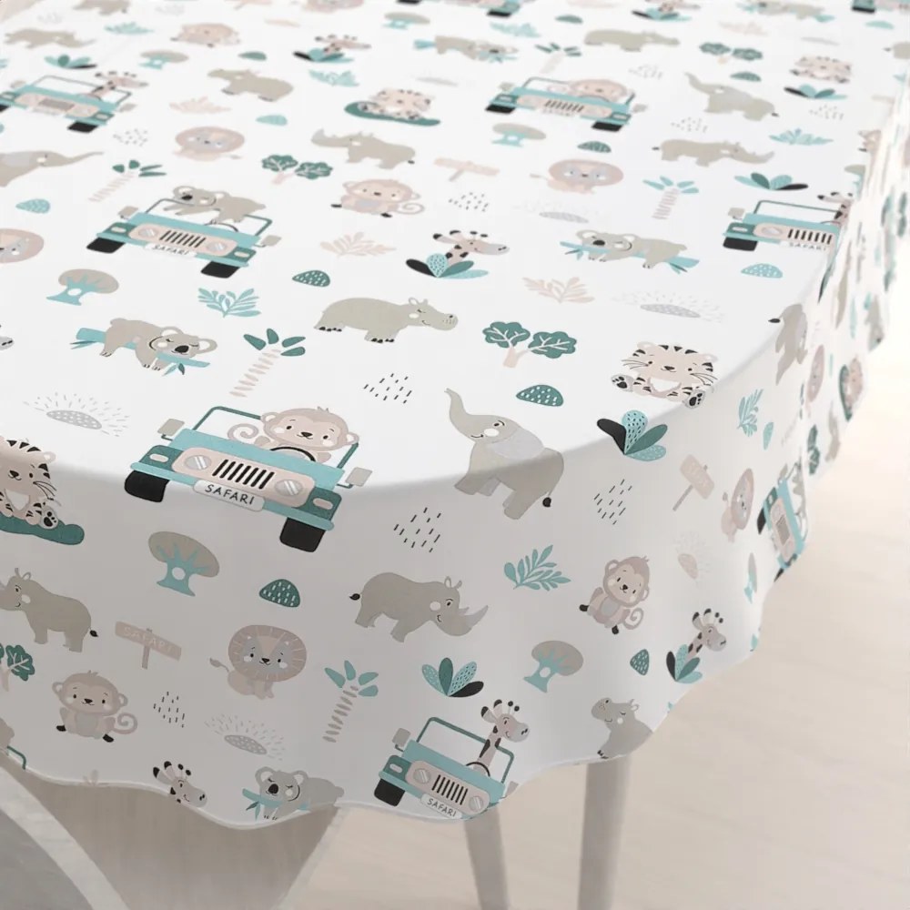 Detský bavlnený oválny dekoračný obrus na stôl s milým detským motívom sivobéžových zvieratiek v Safari s modrozelenými autami na bielom podklade. Je ušitý z husto tkaného 100% bavlneného plátna s certifikátom zdravotnej nezávadnosti Oeko-Tex 100. Obrus dodávame kompletne obšitý. Dekoračné obrusy Sandra sú praktickým doplnkom interiéru Vášho domu, bytu, chalupy a sú vhodné aj do hotelov a reštaurácií. Ako správne zvoliť rozmer obrusu? Uvedené rozmery sú rozmery obrusu, nie stola. Bežný doporučený presah obrusu je cca 20-30 cm na každú stranu stola, tzn. ak máte stôl s rozmerom napr. 60x100 cm, objednávajte obrus s rozmerom 100x140 cm až 120x160 cm, vždy však s prihliadnutím na vlastné individuálne požiadavky. Šijeme v našich krajčírskych dielňach v ČR, ponúkame aj rozmery na mieru.