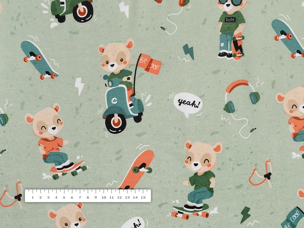 Detský behúň na jedálenský stôl s milým detským motívom medvedíkov na motorkách a skateboardoch na zelenom podklade. Je ušitý z husto tkaného 100% bavlneného plátna s certifikátom zdravotnej nezávadnosti Oeko-Tex 100. Behúň dodávame kompletne obšitý. Dekoračné behúne Sandra sú praktickým doplnkom interiéru Vášho domu, bytu, chalupy a sú vhodné aj do hotelov a reštaurácií. Odporúčaný presah (previs) behúňa je cca 20-30 cm na každej strane stola, tzn. ak máte stôl dlhý napr. 100 cm, objednajte behúň s dĺžkou 140 až 160 cm. Šijeme v našich krajčírskych dielňach v ČR, ponúkame aj rozmery na mieru.