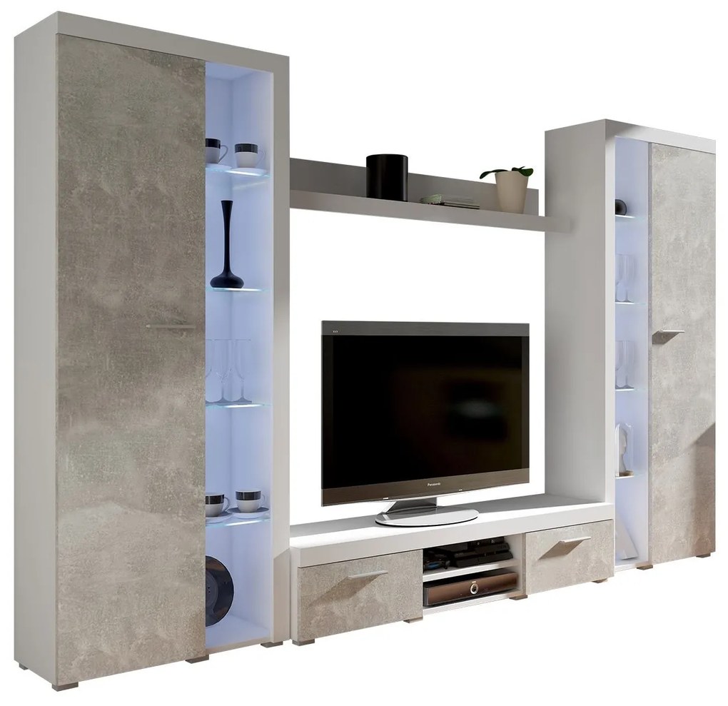 Extrémne funkčná súprava nábytku pozostáva predovšetkým z vysokej skrinky. Vďaka systému delených políc získate praktický úložný priestor. Záverečná časť je priestranná polica na doplnky, zatiaľ čo vitrína je zdobená sklenenými policami na dekorácie a rodinnými suvenírmi. V ďalšej možnosti si môžete kúpiť LED osvetlenie, ktoré dodá vášmu interiéru atmosférickú žiaru. Televízna skrinka zabudovaná do nástennej jednotky do obývacej izby je kombináciou prelamovaných políc (pre dekodér a reproduktor) s otočnými policami na príslušenstvo. Stenovú jednotku dopĺňa stabilná polica, ktorú môžete zavesiť na televízor. Jeho dĺžka je prispôsobená televíznemu stolu. Vďaka módnym farebným kombináciám nástenných jednotiek bude možné úspešne zapadnúť do škandinávskych, priemyselných a minimalistických interiérov.