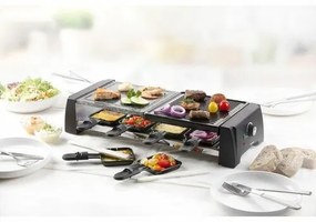 Keď neviete či grilovať na kameni alebo na plechu, tak zvoľte gril DOMO DO9190G pre až 8 ľudí. Jedine tento gril má na polovici prístroja robustný kameň a na druhej polovici grilovací plechový plát.Pre ľahké používanie je gril vybavený kontrolkami zapnutia, nahrievania a nastaviteľným termostatom. Dlhé krútené výhrevné teleso s väčšou hrejivou plochou slúžia pre lepšie výsledky pečenia. Kameň aj dosku jednoducho vyberiete. Rozmery kamennej plochy a dosky sú 21 x 21 cm.Balenie obsahuje 8 malých raclette panvičiek s nepriľnavým povrchom a 8 drevených špachtľou.