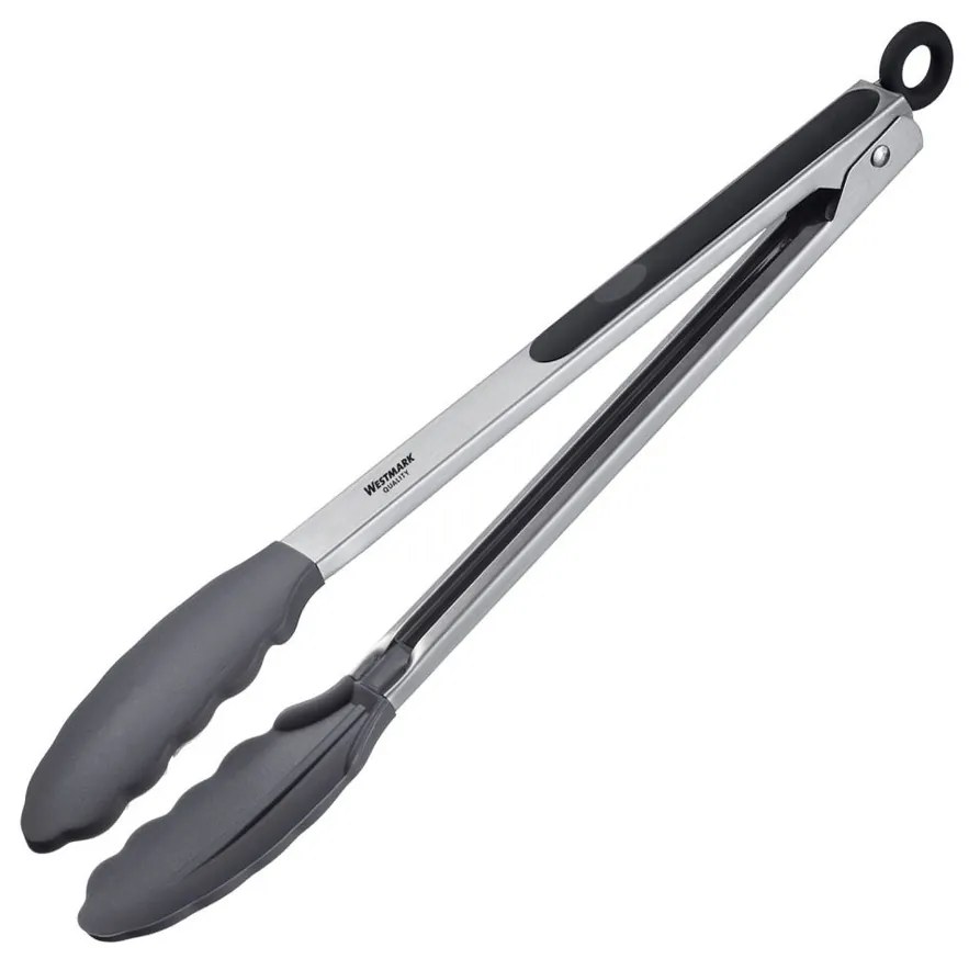 Praktické univerzálne kliešte s dĺžkou 34 cm so silikónovým zakončením nemeckej značky Westmark využijete pri príprave chutných pokrmov na grile aj doma na panvici či v hrnci. Kliešte sú vyrobené z kvalitnej nehrdz. ocele v kombinácii s TPE plastom a silikónom. Sú doplnené praktickým očkom na zavesenie a zaisťovacím mechanizmom brániacim samovoľnému otvoreniu. Teplotná odolnosť až do 240 °C. Sú vhodné do umývačky riadu.
