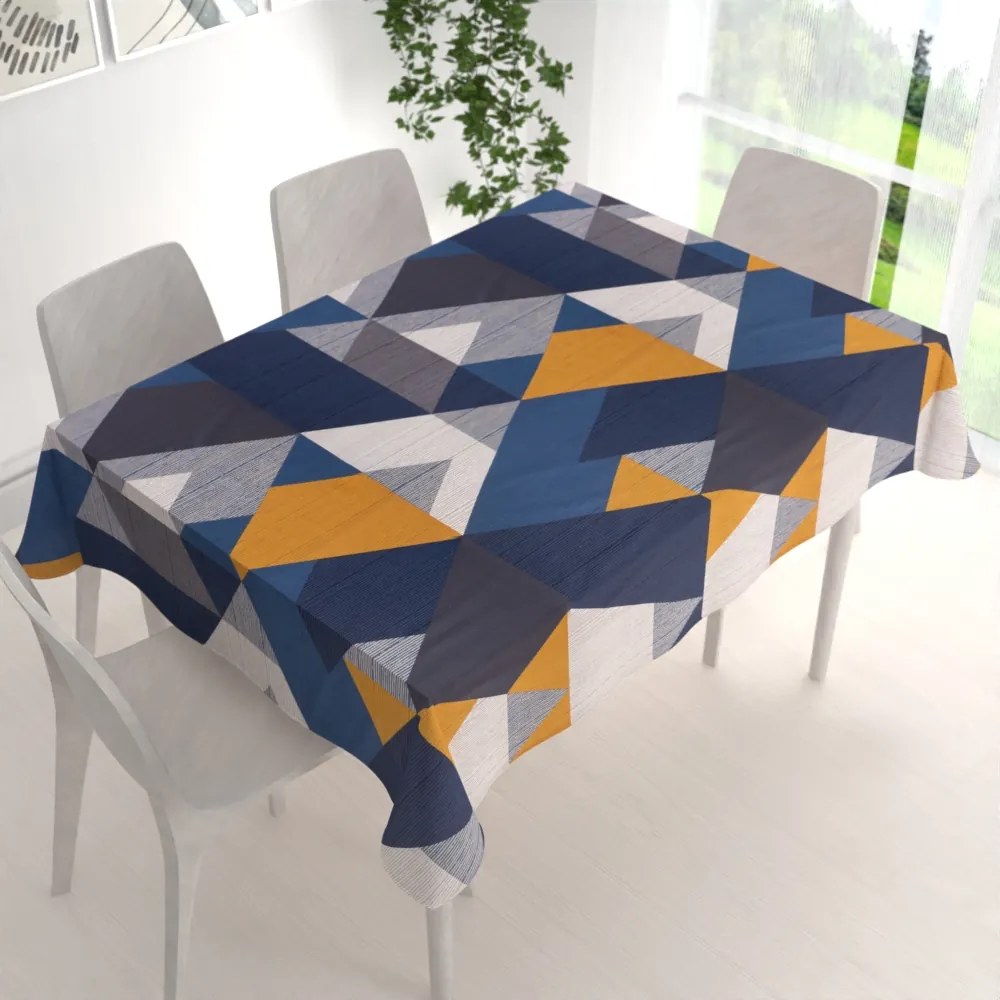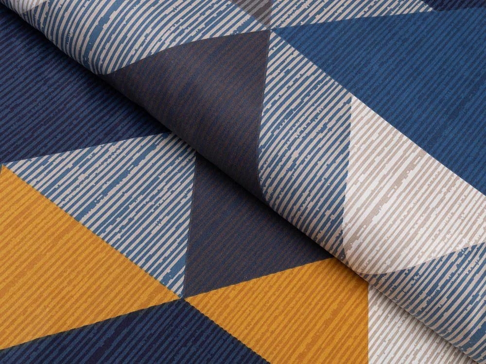Bavlnený obdĺžnikový dekoračný obrus na stôl so vzorom modro-béžovo-oranžových trojuholníkov. Je ušitý z husto tkaného 100% bavlneného plátna s certifikátom zdravotnej nezávadnosti Oeko-Tex 100. Obrus dodávame kompletne obšitý. Dekoračné obrusy Sandra sú praktickým doplnkom interiéru Vášho domu, bytu, chalupy a sú vhodné aj do hotelov a reštaurácií. Ako správne zvoliť rozmer obrusu? Uvedené rozmery sú rozmery obrusu, nie stola. Bežný doporučený presah obrusu je cca 20-30 cm na každú stranu stola, tzn. ak máte stôl s rozmerom napr. 60x100 cm, objednávajte obrus s rozmerom 100x140 cm až 120x160 cm, vždy však s prihliadnutím na vlastné individuálne požiadavky. Šijeme v našich krajčírskych dielňach v ČR, ponúkame aj rozmery na mieru.