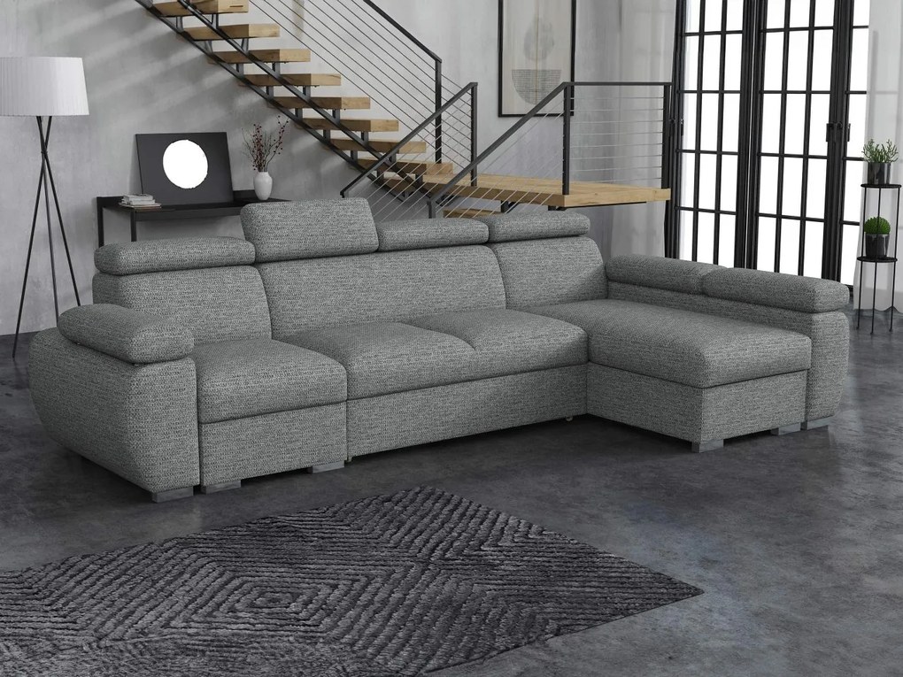 Rozkladacia rohová čalúnená sedacia súprava s úložným priestorom do tvaru L AVESTA pravá sivá