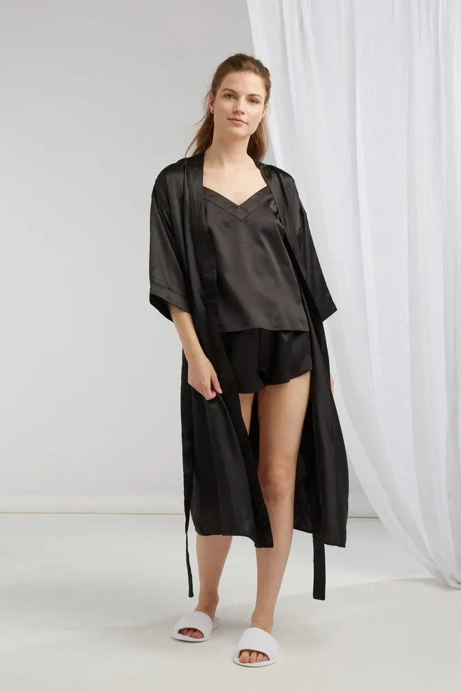 Ľahký dámsky saténový župan v kimono štýle s 3/4 rukávmi, v ktorom sa budete cítiť a vyzerať luxusne. Voľný župan s dĺžkou pod kolená, ktorý sa zaväzuje saténovým opaskom okolo pása. Po stranách sú skryté 2 praktické vrecká. Saténový župan sa hodí ku každej košieľke alebo tielku so šortkami. Materiál: 95% polyester, 5% elastan; 95 g/m²