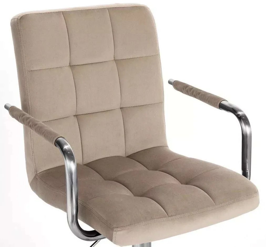 Stolička VERONA VELUR na zlatom tanieri Stolička je vhodná pre moderné kuchyne, reštaurácie, bary, exkluzívne obchody, salóny krásy, kaderníctvo, elegantné kancelárie, informačné miesta, stánky na veľtrhoch. Sedák aj opierka chrbta sú polstrované a potiahnuté jemným prešívaným semišom. Poťah - Velúr (semiš) - zamatovo hebký, mäkký materiál, ktorý je silnejší, odolnejší a jednoduchší na údržbu ako bežné tkaniny. Kovová konštrukcia je výškovo staviteľná, pevná, zaručuje stabilitu stoličky. - Pneumatické nastavenie výšky - Otočné sedadlo (360 stupňov) - Stabilná kovová základňa Rozmery na obrázku - Výška sedadla od zeme min. - 38 cm - Výška sedadla od zeme max.- 56 cm Nosnosť 120 kg