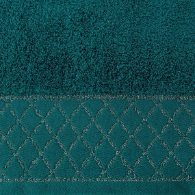 Bavlnený uterák s ozdobným okrajom a lesklou niťou, šírka: 70 cm, dĺžka: 140 cm, farba: tmavotyrkysová, gramáž: 500 GSM, zloženie: 100% bavlna; ozdobná časť: 50% bavlna, 50% polyester.