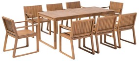 S touto záhradnou súpravou dreveného nábytku môžete vytvoriť štýlové miesto na stretnutia s priateľmi a rodinou. Súprava je vyrobená z odolného akáciového dreva a vďaka modernému lamelovému dizajnu doplní akýkoľvek vonkajší priestor. Stôl s jednoduchými líniami ponúka miesto na stolovanie pre 8 osôb a stoličky so širokými sedadlami a opierkami rúk zaručujú príjemný komfort počas sedenia.