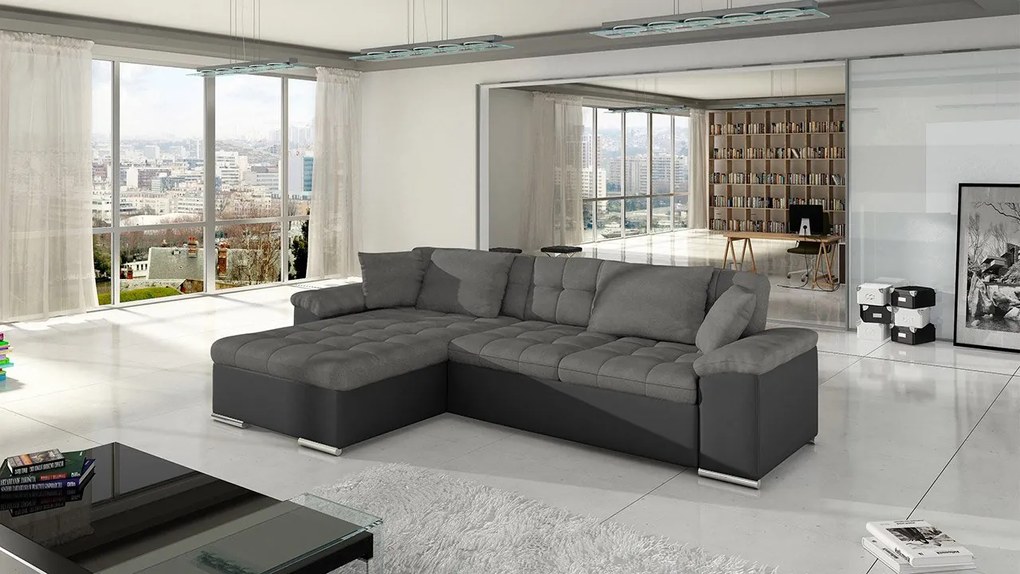 Rozkladacia rohová čalúnená sedacia súprava s úložným priestorom do tvaru L AVESTA pravá sivá