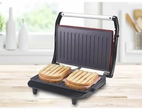 Kompaktný panini sendvičovač BEPER P101TOS002 sa postará o lahodné raňajky a desiaty, pripraví sendviče ľubovoľnej hrúbky a vy si tak doma vychutnáte horúce a chutné kúsky. Vďaka plávajúcim doskám rovnomerne ugriluje sendviče takmer akejkoľvek hrúbky, ale nemusíte zostať len u sendivčov, použitím čerstvých surovín a vďaka vašej kulinárskej fantázii môžete pripraviť rozmanité pokrmy ako grilovaný syr, vaše "osobné" nápadité pizze, ovocné kúsky, bruschetty. Zachráni vás, keď nemáte čas na dlhé postávanie pri platni alebo ísť na obed von, horúce zlatisto opečené panini vás zasýtia a navyše ich máte tak radi.Špecifikácia: s krytom z plastu a bakelitu s hliníkovou rukoväťou, izolovaná, nezahrieva sa, s háčikmi na zatváranie prístroja grilovacie dosky s nepriľnavým povrchom ľahké čistenie vybavené červeným prevádzkovým svetlom stabilné protišmykové nožičky rozmery dosky: 23 x 14,5 cm