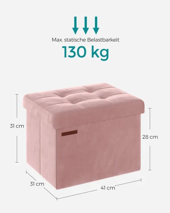 Pohodlná lavička s úložným priestorom až 32 l ponúka priestor na uschovanie posteľnej bielizne, prikrývok, vankúšov, hračiek, kníh a oblečenia. Okrem úložného priestoru ponúka lavička skvelé využitie ako sedačka, podnožka, či stolík. Jej maximálna nosnosť je 300 kg. Parametre produktu: ▪ Farba: ružová ▪ Materiál: MDF, zamat, pena ▪ Rozmery produktu: 31 x 31 x 41 cm ▪ Nosnosť: 130 kg ▪ Inštrukcie k montáži: EN,DE,FR,ES,IT