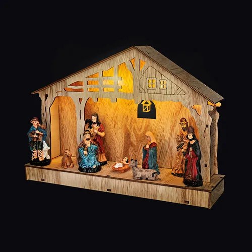 Drevený betlehem s deviatimi farebne maľovanými figúrkami je krásnou a tradičnou vianočnou dekoráciou. Betlehem je podsvietený 7 LED diódami, ktoré svietia príjemným teplým bielym svetlom a vytvoria kúzelnú vianočnú atmosféru.Špecifiakcia: LED drevený betlehem počet LED diód: 7 farba svetla: teplá biela napájanie: 2x AA batéria (nie sú súčasťou) trieda ochrany: IP20 (vnútorné použitie) rozmery: 30 x 21 x 7 cm