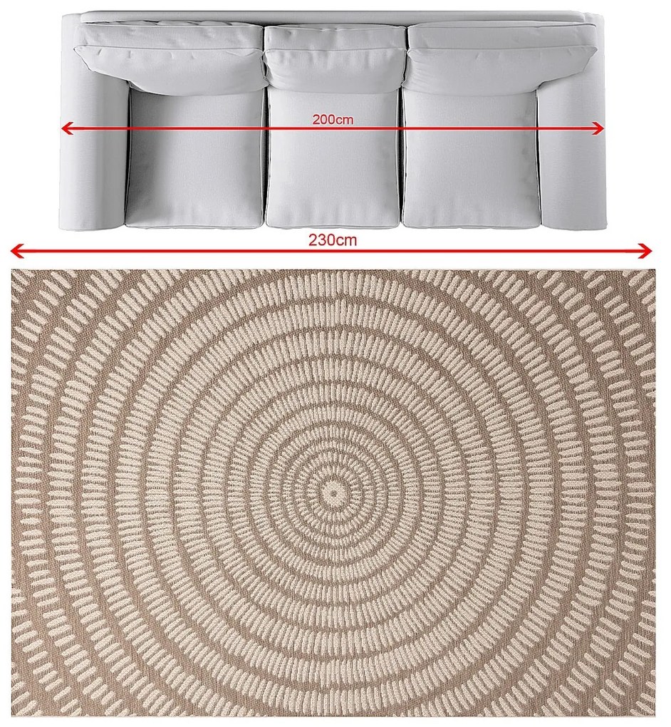 Koberec v teplých hnedých a prírodných farbách s geometrickým vzorom kruhov. Dokonale sa hodí do moderného a minimalistického štýlu. Dobre sa bude vynímať v obývacej izbe, spálni aj v detskej izbe. Vyrobený z polypropylénového materiálu. Polypropylén je odolný a ľahko sa udržiava. Okrem toho ide o syntetický materiál, ktorý zaručuje, že tento koberec je antialergický a antistatický. Vyrobený v Belgicku. Rozmery: 160x230 cm. Zloženie: Zloženie: 100% polypropylén. Farba: hnedá/prírodná.Pokyny na čistenie: pravidelne vysávajte, škvrny okamžite odstráňte vlhkou hubkou, odporúča sa profesionálne chemické čistenie.
