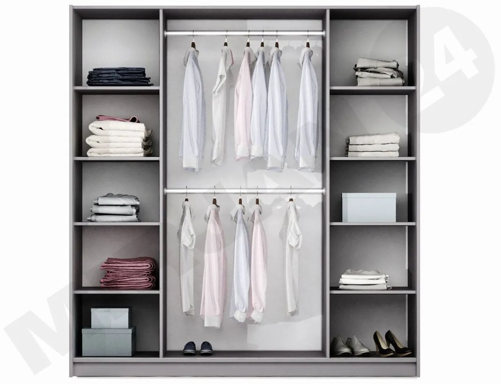 Rozmery: šírka: 209 cm, výška: 219 cm, hĺbka: 65 cm Farby: možnosť výberu farieb tu Vyrobené: laminovaná drevotriesková doska 16 mm, skriňa je vybavená systémom otvárania posuvných a skladaných dverí typu„harmonika“ Hettich horné LED osvetlenie je v cene dlhé jednoduché úchytky stabilná konštrukcia zrkadlo na dvierkach, Záručná doba: 24 mesiacov