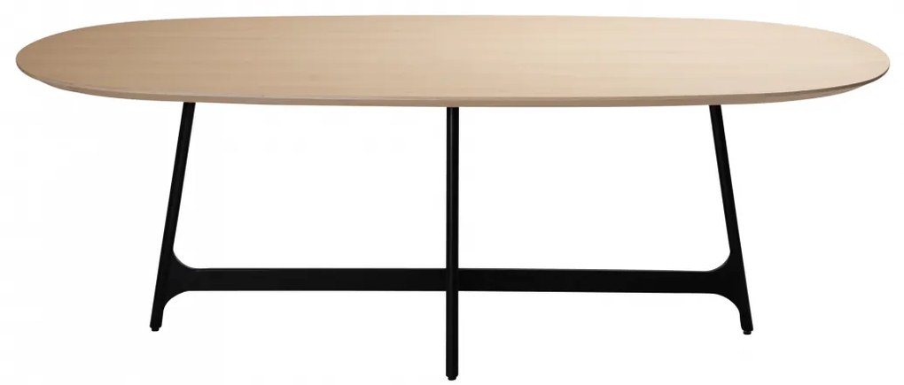 Elegantný a štýlový oválny stôl s oceľovými nohami v čiernej farbe. Doska stola pôsobí ľahko vďaka skoseným hranám a nohy, ktoré sa krížia pod stolom, majú zaoblené detaily pre jemnejší vzhľad.